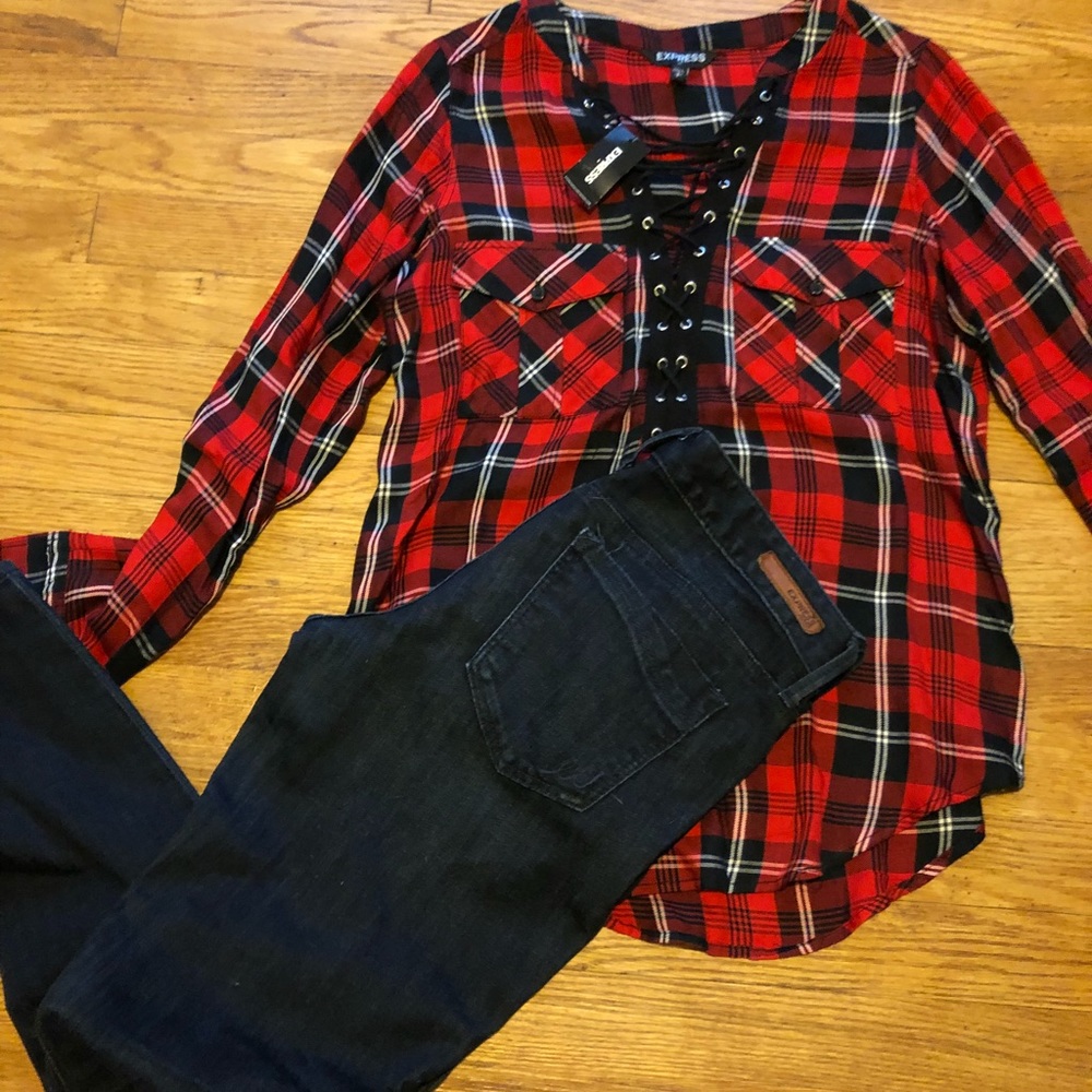 Small express plaid shirt, ties up the front, comfy, but it doesn’t fit me right. The jeans (sold separately) are also for sale and I have 2 pairs available.