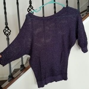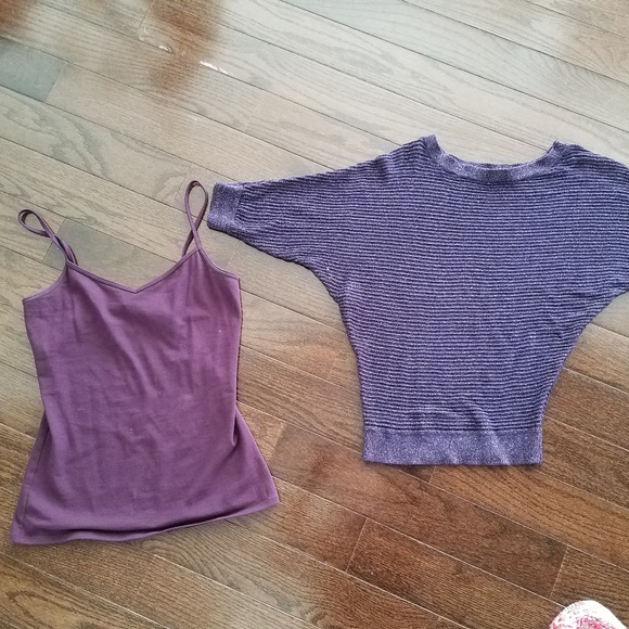Beautiful eggplant/purple dolman off-the-shoulder sweater. It has silver threads running throughout giving it a party vibe! Includes is a purple cami to wear underneath. Perfect for your next date night!