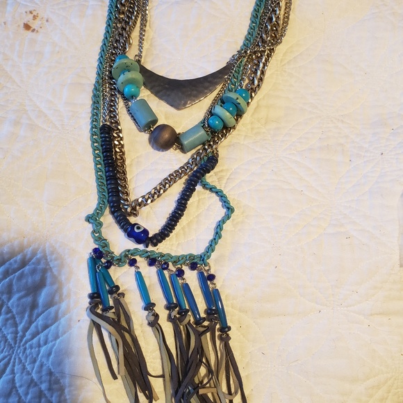 Multi tier necklace with many different aspects, beads, metal plate, leather etc.