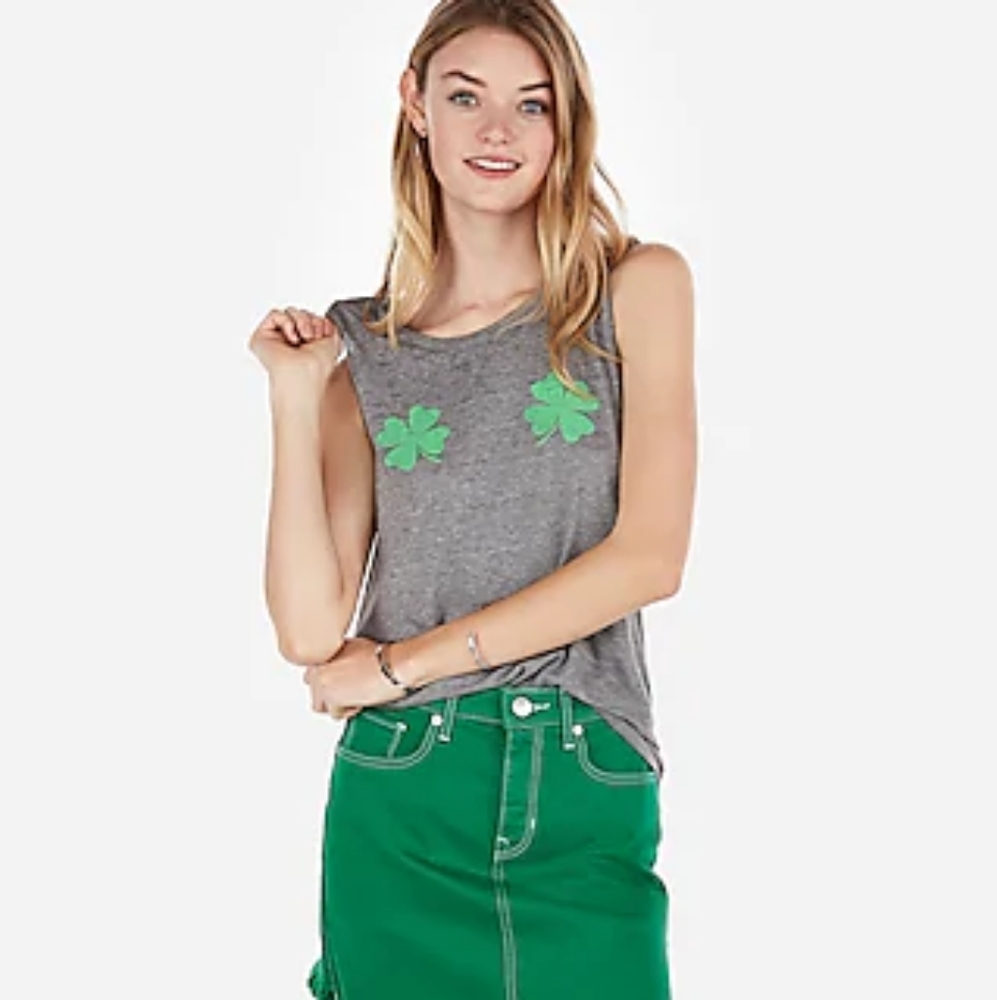New with Tags! Express Double Shamrock Crew Neck Muscle Tank, women's size X-Small (runs big), sleeveless, heather gray color w/ green shamrock front detail, crew neck, hi-lo hem, very soft, stretchy, 50% polyester/38% cotton/12% rayon, measures approx. 16" from underarm to underarm & 24" top to bottom, perfect unworn condition!