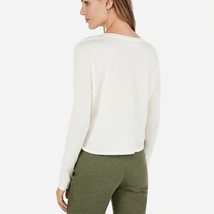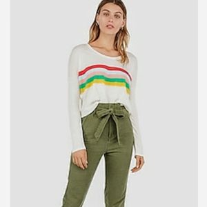 New with Tags! Express Rainbow Striped Long Sleeve Boxy Tee, women's size Medium, boxy fit that hits at waistband, scoop neck, cotton/modal, lightweight, very soft with stretch, creme color with rainbow stripe front graphic, measures approx. 24" from underarm to underarm & 21" from top to bottom, perfect unworn condition!