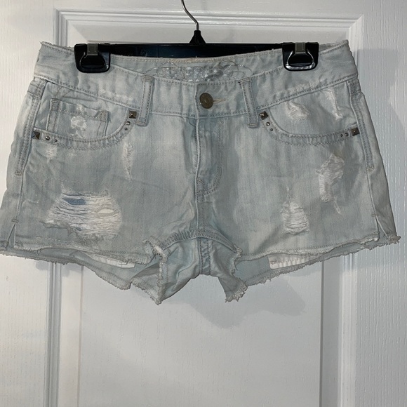 Express women’s denim shorts, 2 inch inseam, size is 4, material is cotton, color is bleached denim.