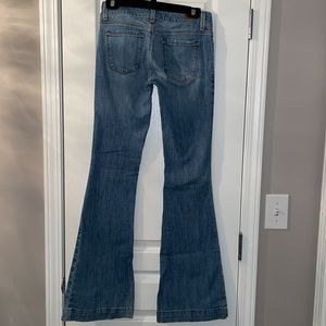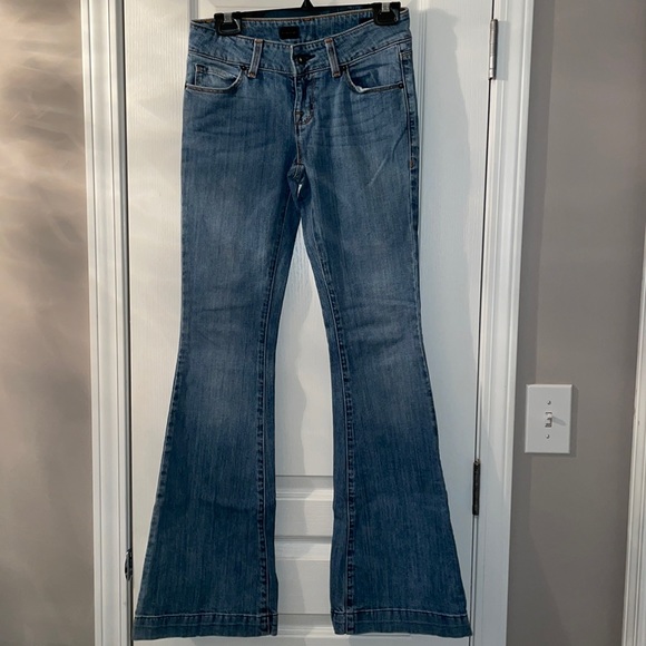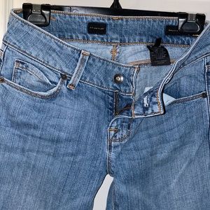 Express women’s jeans in size 0 regular, fit and flare style, low rise, material is cotton and lycra, condition is slightly worn, color is medium denim.