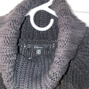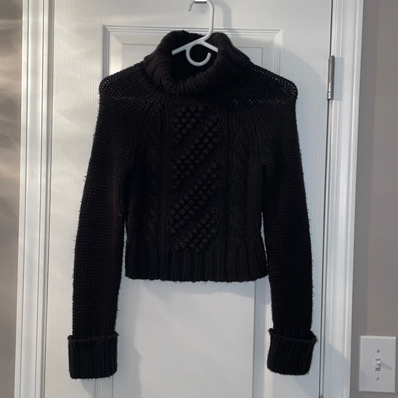 Express women’s turtleneck cropped sweater, size is XS, color is black, material is merino wool and acrylic, condition is worn a few times, cable and Pom Pom on front, and no snags or holes.