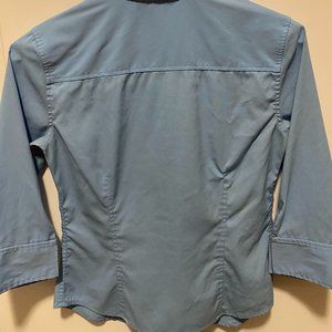 Fits nicely under a blazer. Sleeves go to the elbow. Adjustable sleeves. Needs to be ironed.