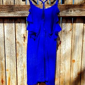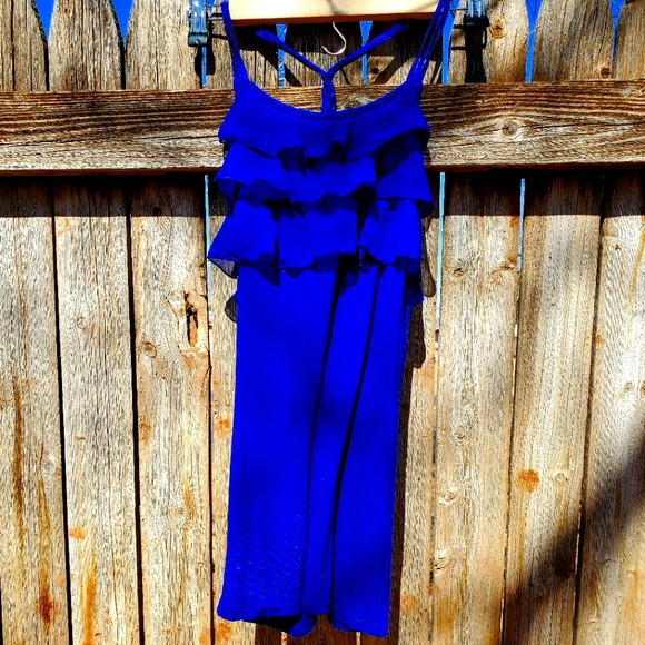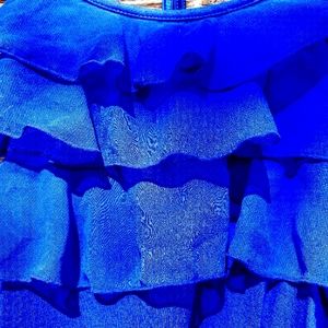 Cami blouse from Express in vibrant royal blue. The size is large. It is semi-sheer rayon, with poly trim. There are three ruffled tiers on the front top and three spaghetti straps on each shoulder and knotted in the back. Perfect for summer! ♡