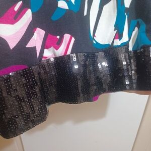 Bright and stretchy with black sequins on square collar and lining bottom of dress