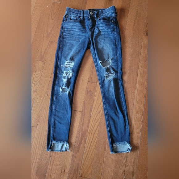 These Express skinny jeans in a classic blue hue feature intentional distressing for a trendy, worn-in look. The medium-wash denim offers a comfortable fit with a touch of stretch, making them perfect for everyday wear. With a slim silhouette these jeans are a versatile addition to any casual wardrobe.