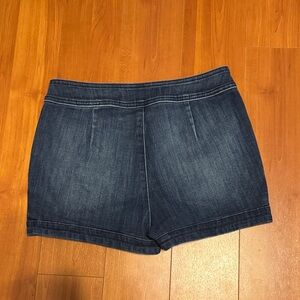 Chic dark blue jean shorts by Express. Features stylish gold button accents. Ideal for casual wear.