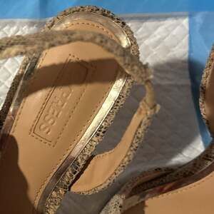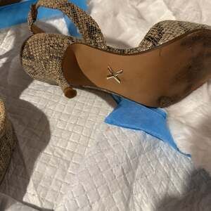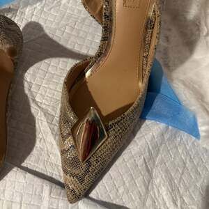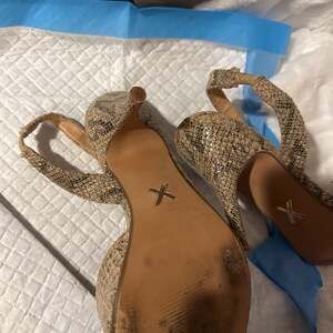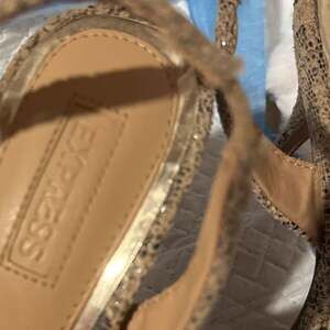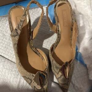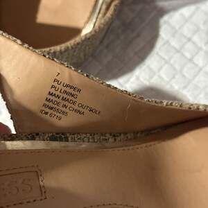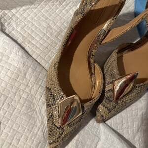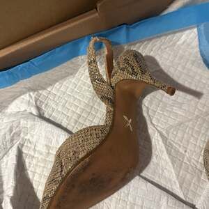 Step out in style with these chic Express snake print slingback heels, size 7. These pointed-toe pumps feature an eye-catching metallic geometric detail on the vamp, adding a touch of modern sophistication. The adjustable slingback strap ensures a secure and comfortable fit, while the subtle snake print provides a versatile yet bold look perfect for any occasion. Made with a PU upper and lining, and a man-made outsole. Excellent pre-owned condition with minimal wear on the soles.