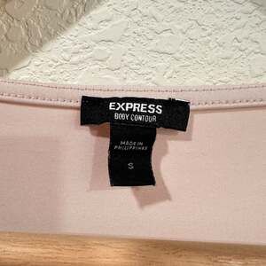 Express Sleek V-Neck Bodysuit in a soft blush pink/nude tone. This versatile staple features a flattering deep v-neckline and a smooth, form-fitting silhouette.