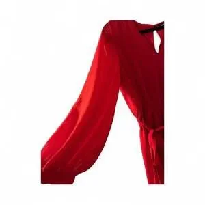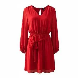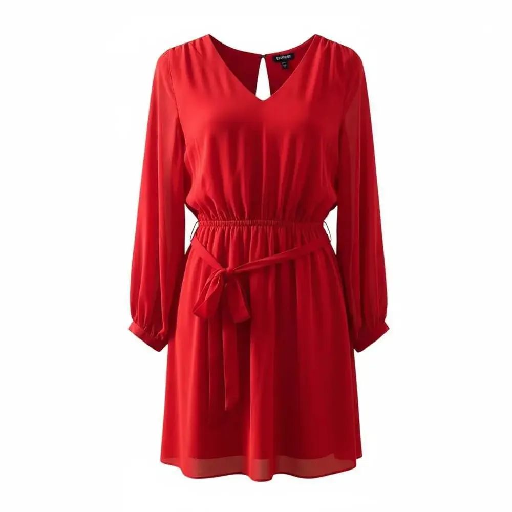 This Express red V-neck long sleeve mini dress features a flattering tie waist, perfect for creating a chic silhouette. The vibrant red color and elegant design make it ideal for various occasions, from casual outings to more dressed-up events. With its comfortable fit and stylish details, this dress is a versatile addition to any wardrobe. New with tags condition, as shown in imagery.