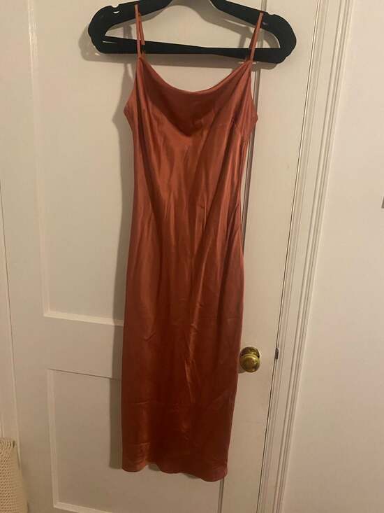 Express Satin Cowl Neck Midi Dress in a beautiful terracotta rust color. This elegant slip-style dress features delicate spaghetti straps and a flattering draped neckline, perfect for cocktail parties, weddings, or a formal evening out. The fabric has a smooth, silky finish that catches the light beautifully. Great pre-owned condition with no visible flaws or snags.