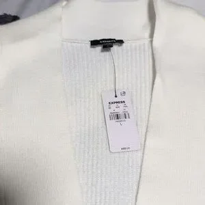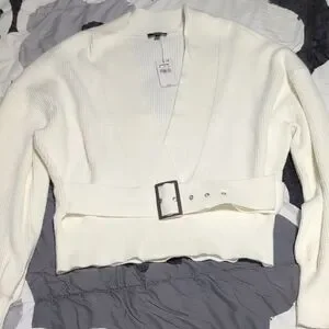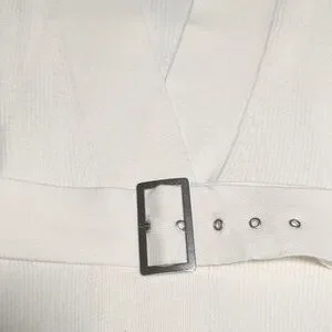 Elegant white belted V-neck sweater with a wide self-tie belt and buckle. Soft ribbed knit offers comfortable stretch and a flattering fit. Versatile layering piece that pairs easily with jeans or skirts. Easy-care and designed for everyday wear.