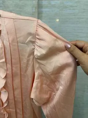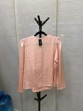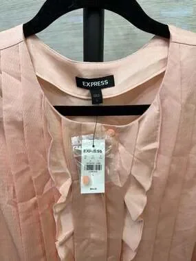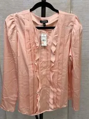 New with tags Express pink ruffle front long sleeve blouse, Size L. This elegant top features vertical pleating and feminine ruffle detailing along the front placket. Designed with slightly puffed shoulders and a lightweight, silky fabric, it's perfect for business casual wear or special occasions. Includes original tags and spare button. Brand new condition with no flaws.