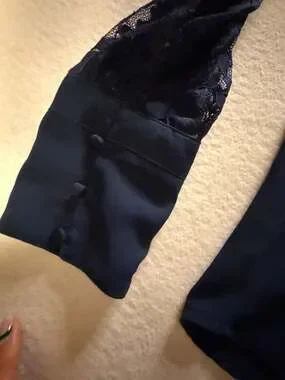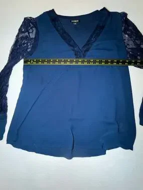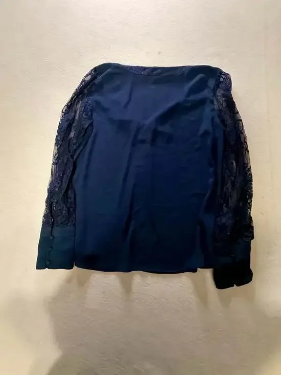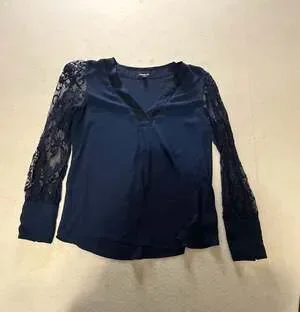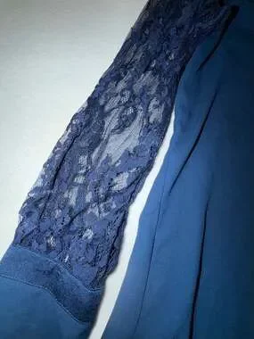 Express Long Sleeve Lace Blouse in Navy Blue, Size Medium. This elegant top features sheer lace sleeves and a delicate lace-trimmed V-neckline. The cuffs are finished with a sophisticated covered button detail. Perfect for work-to-evening transitions or a dressy night out.