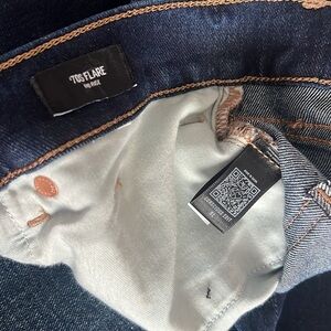 These Express jeans feature a mid ride waist and a classic flare silhouette, offering a stylish nod to 1970s fashion. The deep blue denim provides a polished look, perfect for both casual and dressy occasions. Enjoy a flattering fit that is snug through the hips and thighs before elegantly widening at the hem.