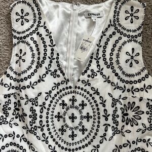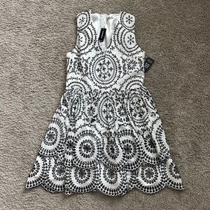 This elegant dress features a beautiful black and white design, perfect for any special occasion. Back zipper. Interior lining. V neck. Fits true to size. New with tags.