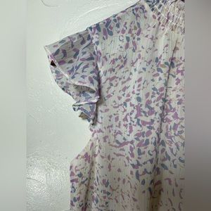 Express womens short sleeve blouse. Lined body. 100% polyester. Machine washable. Multicolored lavender, periwinkle sand off white.