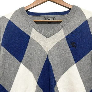 Express Argyle Pullover Sweater Size XL Gray Long Sleeve V-Neck Preppy
