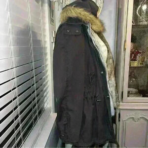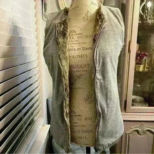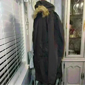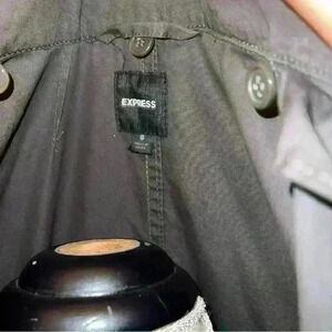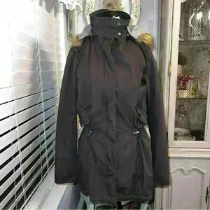 Express Army green utility jacket with detachable hood and inner faux fur vest. Full front zipper on jacket and inside fur vest. Vest can be worn by itself. Pre-owned in new condition.