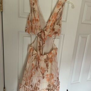 This versatile dress is casual enough for day but can be dressed up for evening as well. Shimmery off white fabric with peach and brown floral print. Ties in the back and has a flattering low back design.