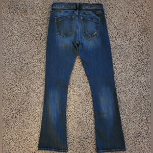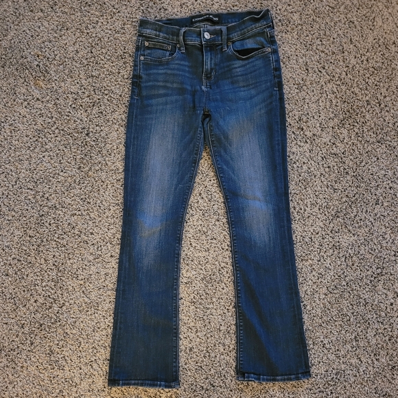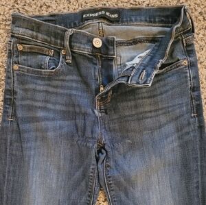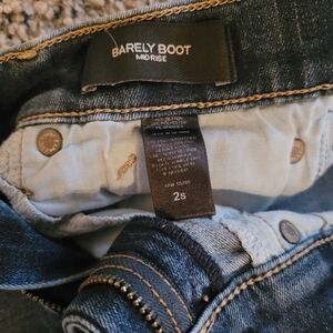 Express barely boot mid rise jeans, size 2S. Stylish and comfortable blue jeans perfect for any occasion. These jeans offer a flattering fit and versatile style. Small flaw on the hem on the front pictured, but it is not noticeable when the jeans are on.