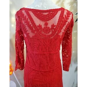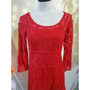 Express Baroque Red Lace 3/4 Sleeve Mini Shift Cocktail Dress Womens Size S Scoop Neck Layered