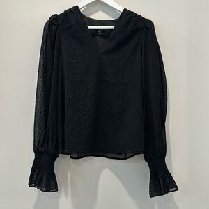 Features: long sleeve, smocked cuff, v neck, sheer sleeve, balloon sleeve, accent sleeve, polka dot, career wear blouse