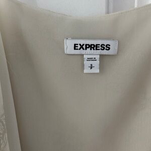 Chic beige blouse with floral pattern. Features ruffle details and tie front. Ideal for versatile styling.