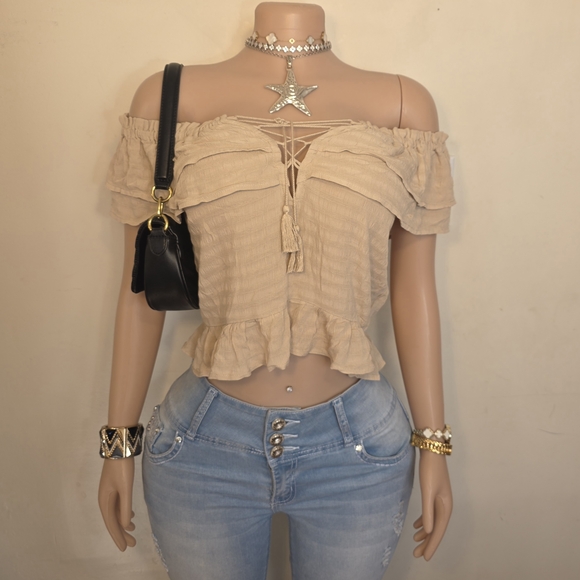 Express off-shoulder blouse in a soft beige tone. Features lace-up front with tassel detail. Ruffled hem and layered sleeves. Lightweight, textured fabric. Feminine and casual style.