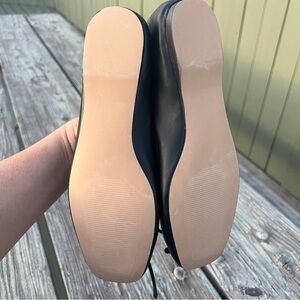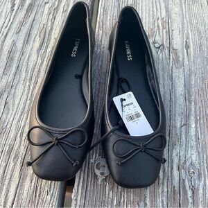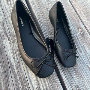 These Express black ballet flats feature a timeless design with a rounded toe and a charming decorative bow. Crafted from a leather-like material, they offer a sleek, minimalist look perfect for both casual and business settings. The slip-on style ensures easy wear and comfort throughout the day.