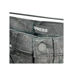 These Express ankle skinny jeans in size 00R feature a black coated python/snake print design. They have a mid-rise waist and are made of a blend of polyester, spandex, rayon, and cotton with a denim fabric type. The jeans fasten with a zip and button closure and are detailed with button and zipper accents. The design includes a logo, and the jeans offer a comfortable and breathable fit. in very good. condition.