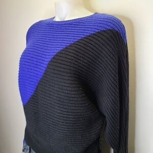 Express Black Cobalt Blue Colorblock Dolman Sleeve Ribbed Chunky Knit Sweater size XS. Chunky knit ribbed sweater. The colors are alternating black and Cobalt Blue/ electric blue. Dolman sleeves. Shorter length, boxy style. Viscose polyester nylon spandex blend. The knit has an all over light fuzzy texture. In very good preowned condition. Worn only a couple of times.
