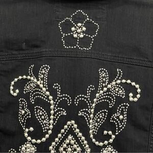 • Unique black cropped denim jean jacket with beautiful design on back with silver beading & embroidery