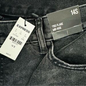 These Express jeans boast a chic black hue and a fashionable flare and wide leg silhouette, perfect for elevating any outfit. The full-length design offers a sleek and elongated look, while the pristine condition ensures a fresh and polished appearance. Ideal for both casual outings and more formal occasions, these jeans are a versatile wardrobe staple.