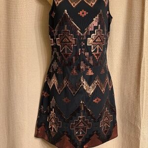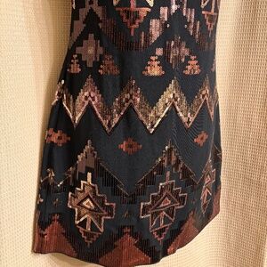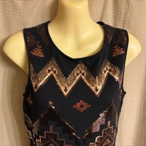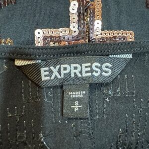 The Express Black & Gold Sequin Dress is a stylish and elegant choice for parties and cocktail events. This sleeveless dress features a geometric pattern with black and gold sequin accents, adding a touch of glamour to the sheath silhouette. The knit fabric and stretch features ensure a comfortable and flattering fit, making it a versatile option for summer, fall, and spring occasions. With its round neckline and short length, this dress is perfect for a night out to shine.