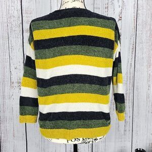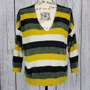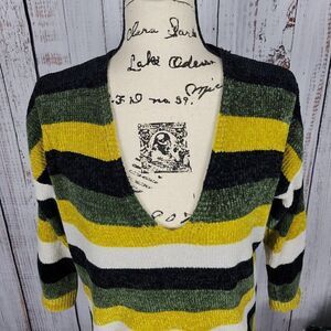 Item: Express Black Green Yellow & White Striped Small Soft Knit Cozy V-Neck Sweater. This sweater will make you feel like you are wearing clouds! SO SOFT! Barely cropped in length. Beautiful color scheme!