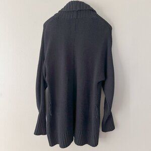 Stylish black knit cardigan from Express. Features a cozy shawl collar and 2 front pockets. 2 belt loops stitched into sweater. Great pre-loved condition. Length: 34”, nice heavy weight. Some very light pilling throughout.