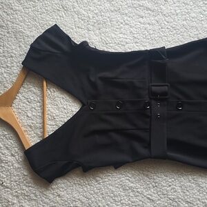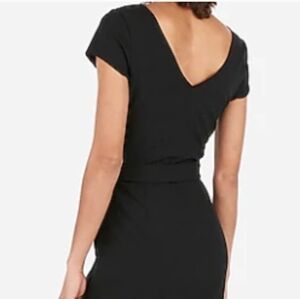 Chic black midi dress with button accents. V-neckline and short sleeves. Perfect for versatile styling.