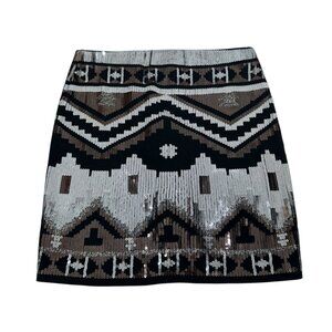 This Express black mini skirt features a striking sequin Aztec geometric pattern, making it suitable for stylish and sophisticated wear.