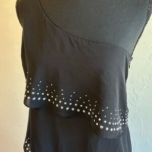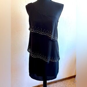 Sleek black one-shoulder dress featuring stylish silver studded details on ruffles. Perfect for a night out. Sz 6