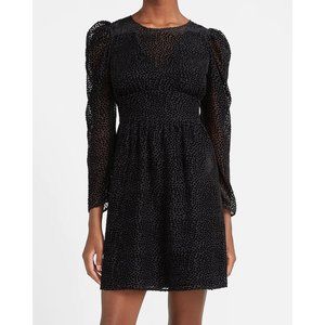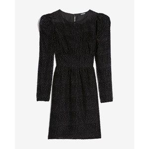 This elegant black mini dress from Express features a pleated fit and flare design, perfect for a cocktail night out. The dress boasts long puff sleeves and a classic crew neck, offering a sophisticated and stylish look.