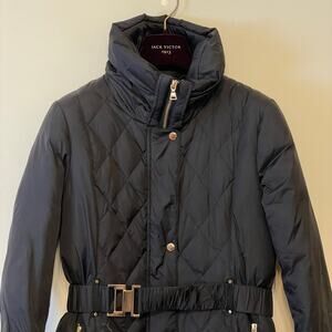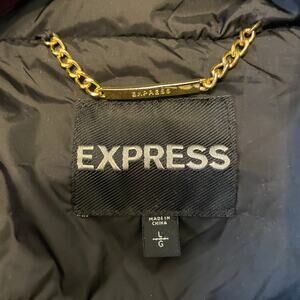Stylish black quilted Express puffer coat. Features a belted waist and zip pockets with gold colored hardware. Perfect for cold weather! Used but great condition! Size large but fits like a medium.