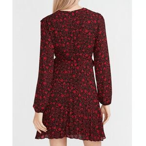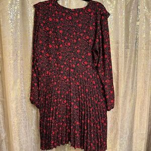 Express Black Red Rose Floral Pleated Long Sleeve V Neck Dress XL