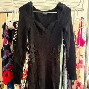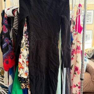 Stylish black ribbed knit dress with lace side cut out. Comfortable and great for a winter party or event.