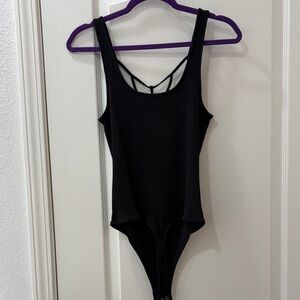 Ribbed tank bodysuit with scoop neckline and strappy detail. Bodysuits is very stretchy. Thin shoulder straps. Snap closure at the bottom. Simple, sleek layering piece. Tried on a few times but never worn.