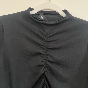 This elegant black ruched top is perfect for any occasion. Its sleek design offers a flattering fit, making it a versatile addition to your wardrobe.