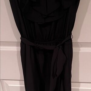 Chic black mini dress with ruffle detail. Sleeveless design. Perfect for day or night.