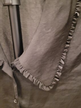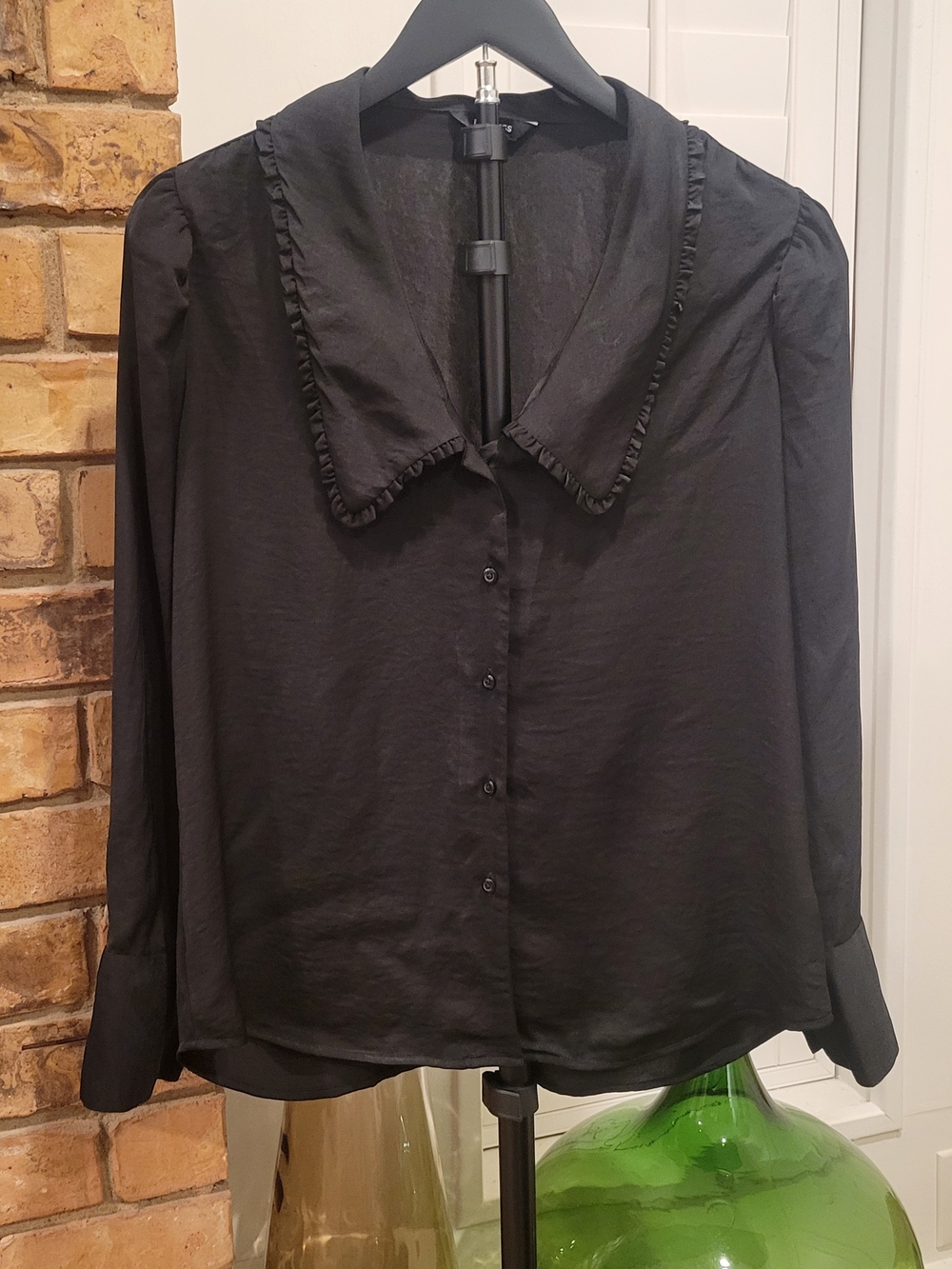 Elegant black blouse with a wide ruffle-trim collar. Button-front silhouette for easy styling. Long sleeves with subtle cuff shaping. Lightweight drape for a polished look.